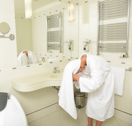 バスルームでシャンプーをする前に、