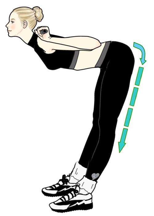 スクワットの時のように、腰はなるべく後ろへ、