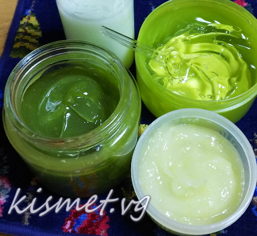 右手前の、非常に淡くて白っぽいグリーンのアロエジェルブレンド『お手軽ジェル』、